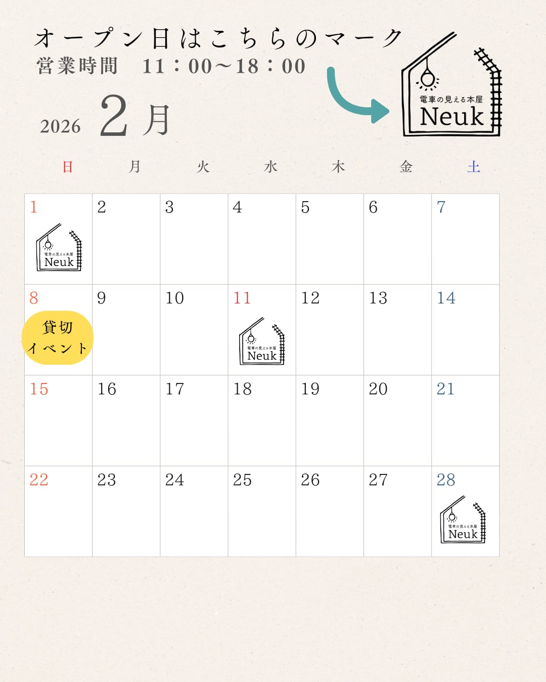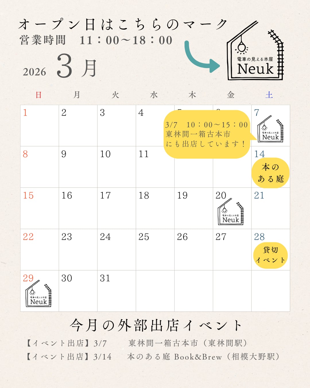 営業日:土日祝 不定期※月により営業日が異なります。SNS等で営業日カレンダーをご確認ください。定休日:平日※オンラインショップは平日も発送します。アクセス:神奈川県相模原市南区8-11-17電車の見える本屋 Neuk(ヌーク)